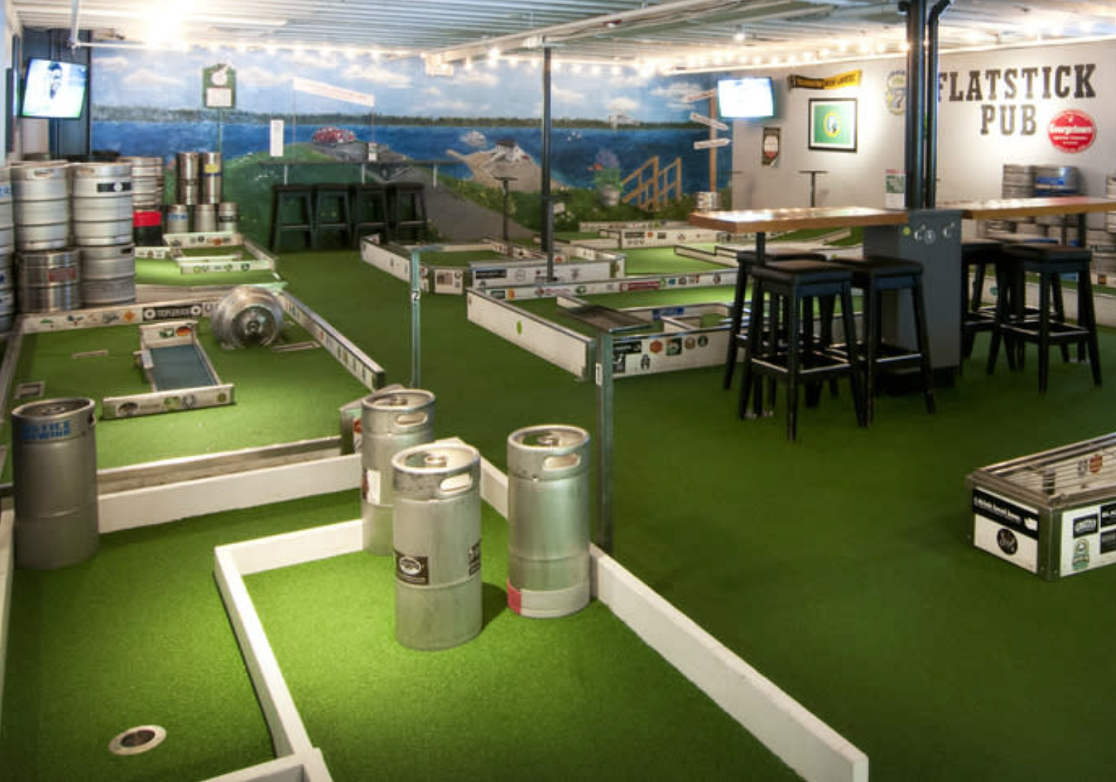 Flat Stick Pub在柯克兰和先锋广场的两处地点都有9洞的室内迷你高尔夫球场,有 "水障碍 "和障碍物(如啤酒桶)。虽然这可能更适合于爸爸妈妈的约会之夜,但孩子们可以在柯克兰的位置上玩到晚上7点。